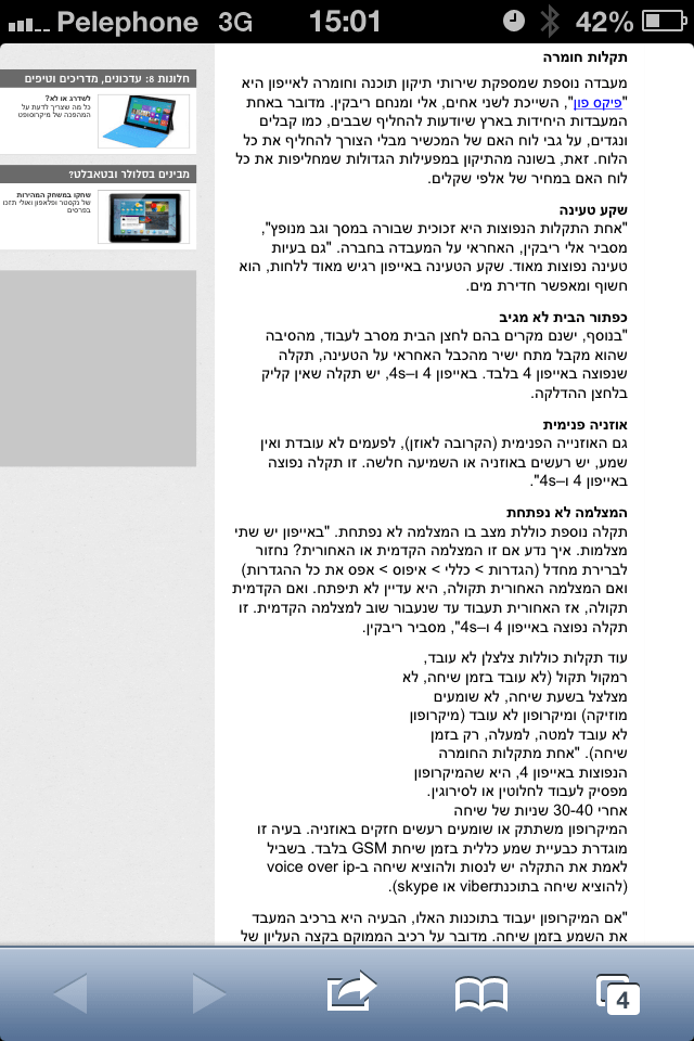 "בנוסף, ישנם מקרים בהם לחצן הבית מסרב לעבוד, מהסיבה שהוא מקבל מתח ישיר מהכבל האחראי על הטעינה, תקלה שנפוצה באייפון 4 בלבד.